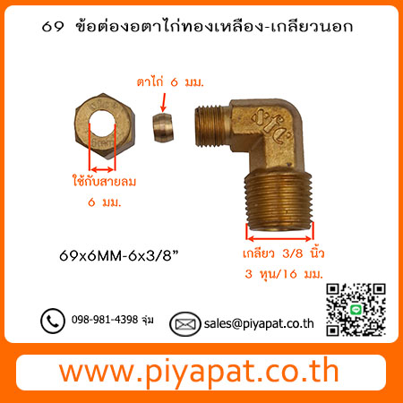 69 ข้องอตาไก่ทองเหลือง-เกลียวนอก เสียบสายลม 6 มม. เกลียว 3/8 นิ้ว/3 หุน 16 มม. 69x6MM-6x3/8"