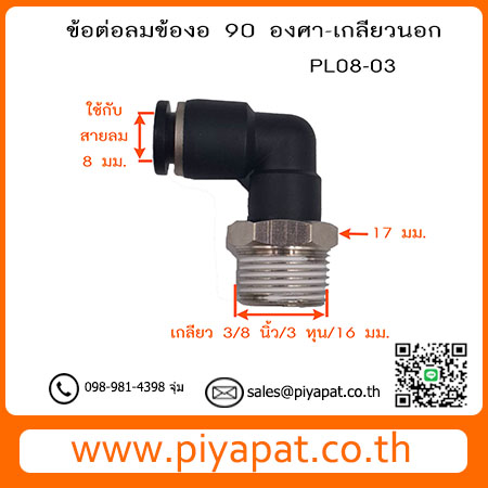 ข้อต่อลมข้องอ 90 องศา ท่อลม 8 มม. เกลียว 3/8" /3 หุน/16 มม. PL08-03