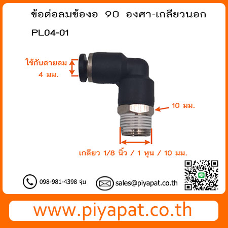 ข้อต่อลมข้องอ 90 องศา-เกลียวนอก ท่อลม 4 มม. เกลียว 1/8 นิ้ว/1 หุน,/10 มม. PL04-01