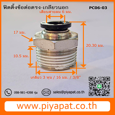 ข้อต่อลมตรง-เกลียวนอก ท่อลม 6 มม. เกลียว 3 หุน / 16 มม./ 3/8" : PC06-03