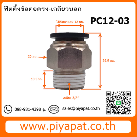 ข้อต่อสายลมตรง-เกลียวนอก ท่อลม 12 มม. เกลียว 3/8" PC12-03