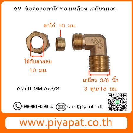 69 ข้องอตาไก่ทองเหลือง-เกลียวนอก เสียบสายลม 10 มม. เกลียว 3/8 นิ้ว/3 หุน 16 มม. 69x10MM-6x3/8"