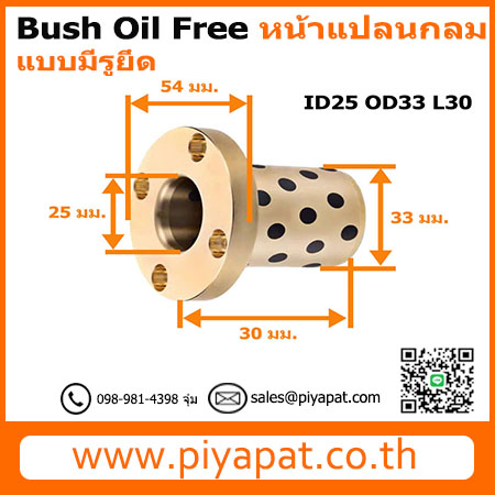 บุชออยฟรีทองเหลืองกราไฟต์ หน้าแปลน แบบกลม มีรูยึด รูเพลา 25 มม. โตนอก 33 มม. ยาว 30 มม. : ID25 OD33 L30