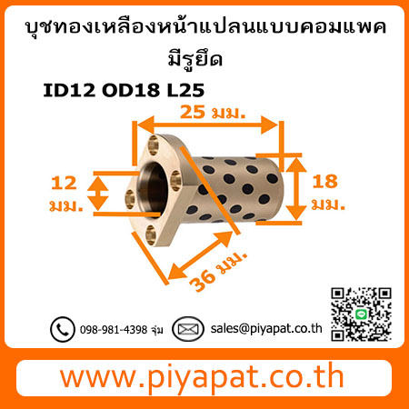 บุชออยฟรีทองเหลืองกราไฟต์ หน้าแปลน แบบคอมแพค มีรูยึด รูเพลา 12 มม. โตนอก 18 มม. ยาว 25 มม. : ID12 OD18 L25
