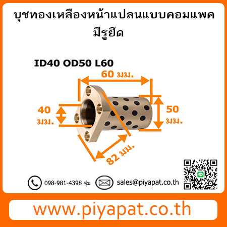 บุชออยฟรีทองเหลืองกราไฟต์ หน้าแปลน แบบคอมแพค มีรูยึด รูเพลา 40 มม. โตนอก 50 มม. ยาว 60 มม. : ID40 OD50 L60