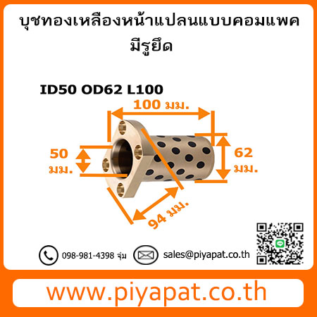 บุชออยฟรีทองเหลืองกราไฟต์ หน้าแปลน แบบคอมแพค มีรูยึด รูเพลา 50 มม. โตนอก 62 มม. ยาว 100 มม. : ID50 OD62 L100