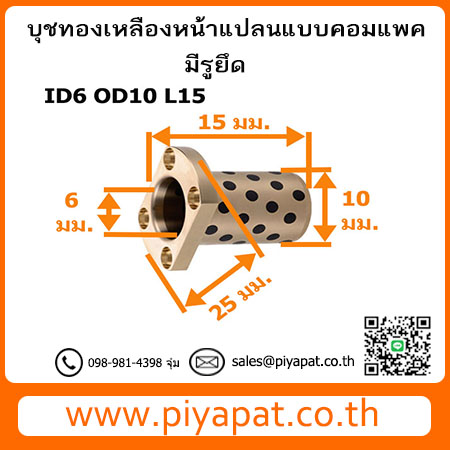 บุชออยฟรีทองเหลืองกราไฟต์ หน้าแปลน แบบคอมแพค มีรูยึด รูเพลา 6 มม. โตนอก 10 มม. ยาว 15 มม. : ID6 OD10 L15