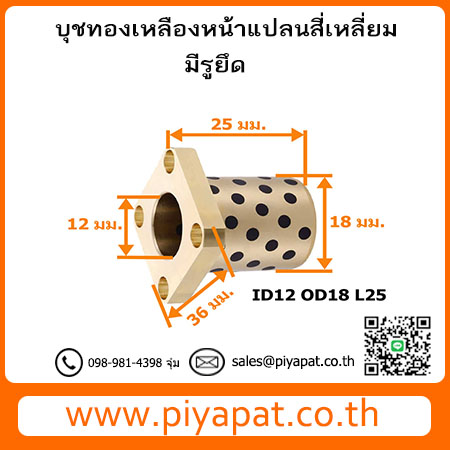 บุชออยฟรีทองเหลืองกราไฟต์ หน้าแปลน แบบสี่เหลี่ยม มีรูยึด รูเพลา 12 มม. โตนอก 18 มม. ยาว 25 มม. : ID12 OD18 L25