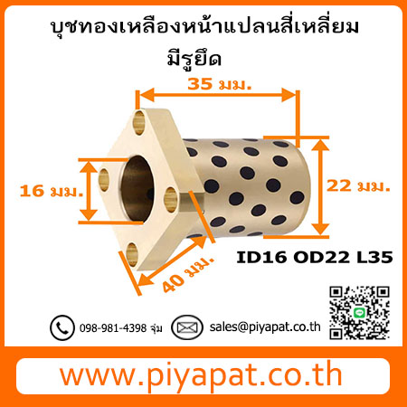 บุชออยฟรีทองเหลืองกราไฟต์ หน้าแปลน แบบสี่เหลี่ยม มีรูยึด รูเพลา 16 มม. โตนอก 22 มม. ยาว 35 มม. : ID16 OD22 L35