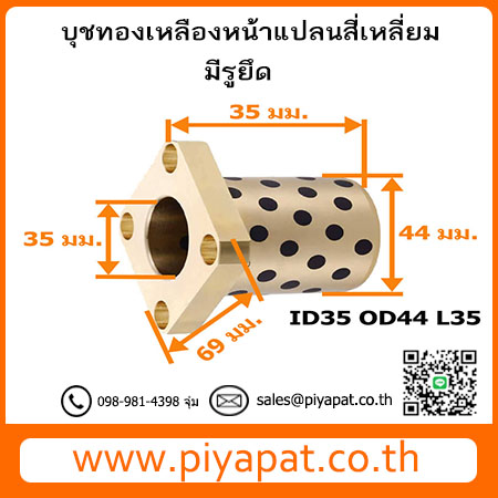 บุชออยฟรีทองเหลืองกราไฟต์ หน้าแปลน แบบสี่เหลี่ยม มีรูยึด รูเพลา 35 มม. โตนอก 44 มม. ยาว 35 มม. : ID35 OD44 L35