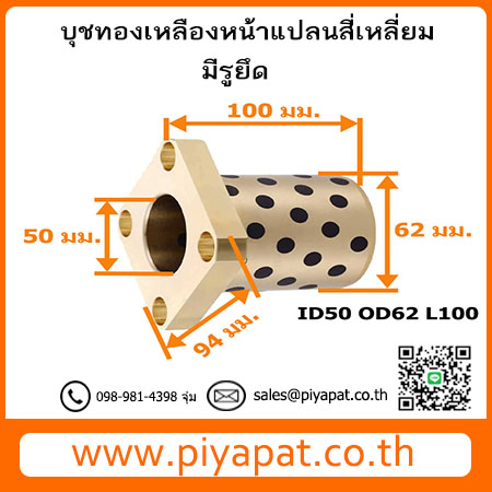 บุชออยฟรีทองเหลืองกราไฟต์ หน้าแปลน แบบสี่เหลี่ยม มีรูยึด รูเพลา 50 มม. โตนอก 62 มม. ยาว 100 มม. : ID50 OD62 L100