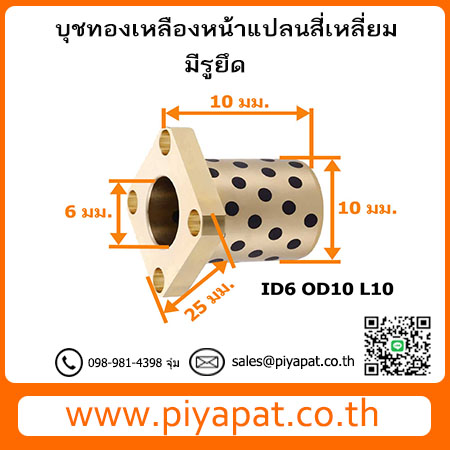 บุชออยฟรีทองเหลืองกราไฟต์ หน้าแปลน แบบสี่เหลี่ยม มีรูยึด รูเพลา 6 มม. โตนอก 10 มม. ยาว 10 มม. : ID6 OD10 L10