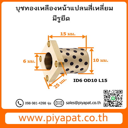 บุชออยฟรีทองเหลืองกราไฟต์ หน้าแปลน แบบสี่เหลี่ยม มีรูยึด รูเพลา 6 มม. โตนอก 10 มม. ยาว 15 มม. : ID6 OD10 L15