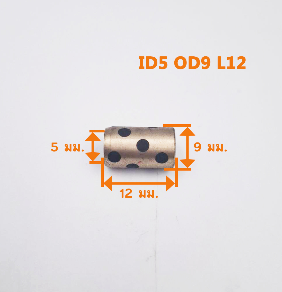 บุชออยฟรีทองเหลืองกราไฟต์ โต 9 มม. รูเพลา 5 มม. ยาว 12 มม. : OD9 ID5 L12