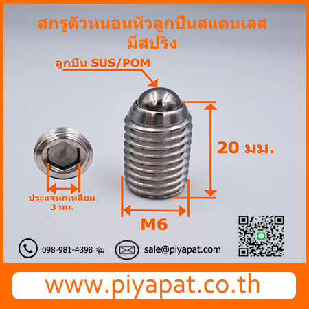 สกรูตัวหนอนหัวลูกปืนสแตนเลส แบบมีสปริง โตนอก 6 มม. ยาว 20 มม. : M6x20