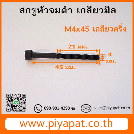 สกรูหัวจมดำ เกลียวมิล ขนาด M4 ระยะพิตซ์ 0.70 มม. ยาว 45 มม. : M4x45 เกลียวครึ่ง