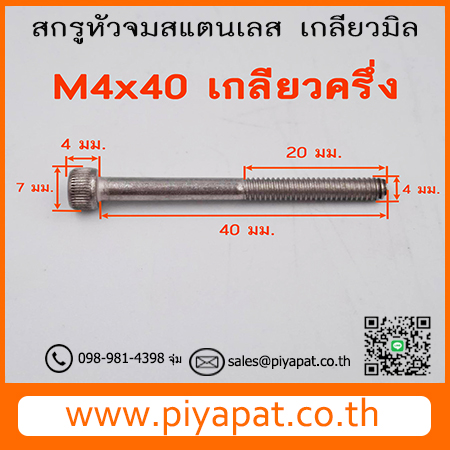 สกรูหัวจมสแตนเลส ขนาด M4 ระยะพิตซ์ 0.70 มม. ยาว 40 มม. : M4x40 เกลียวครึ่ง