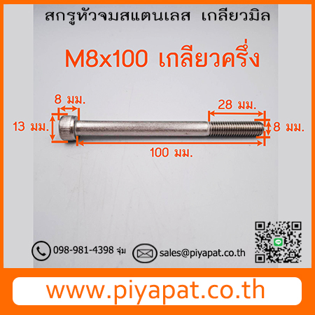 สกรูหัวจมสแตนเลส ขนาด M8 ระยะพิตซ์ 1.25 มม. ยาว 100 มม. : M8x100 เกลียวครึ่ง